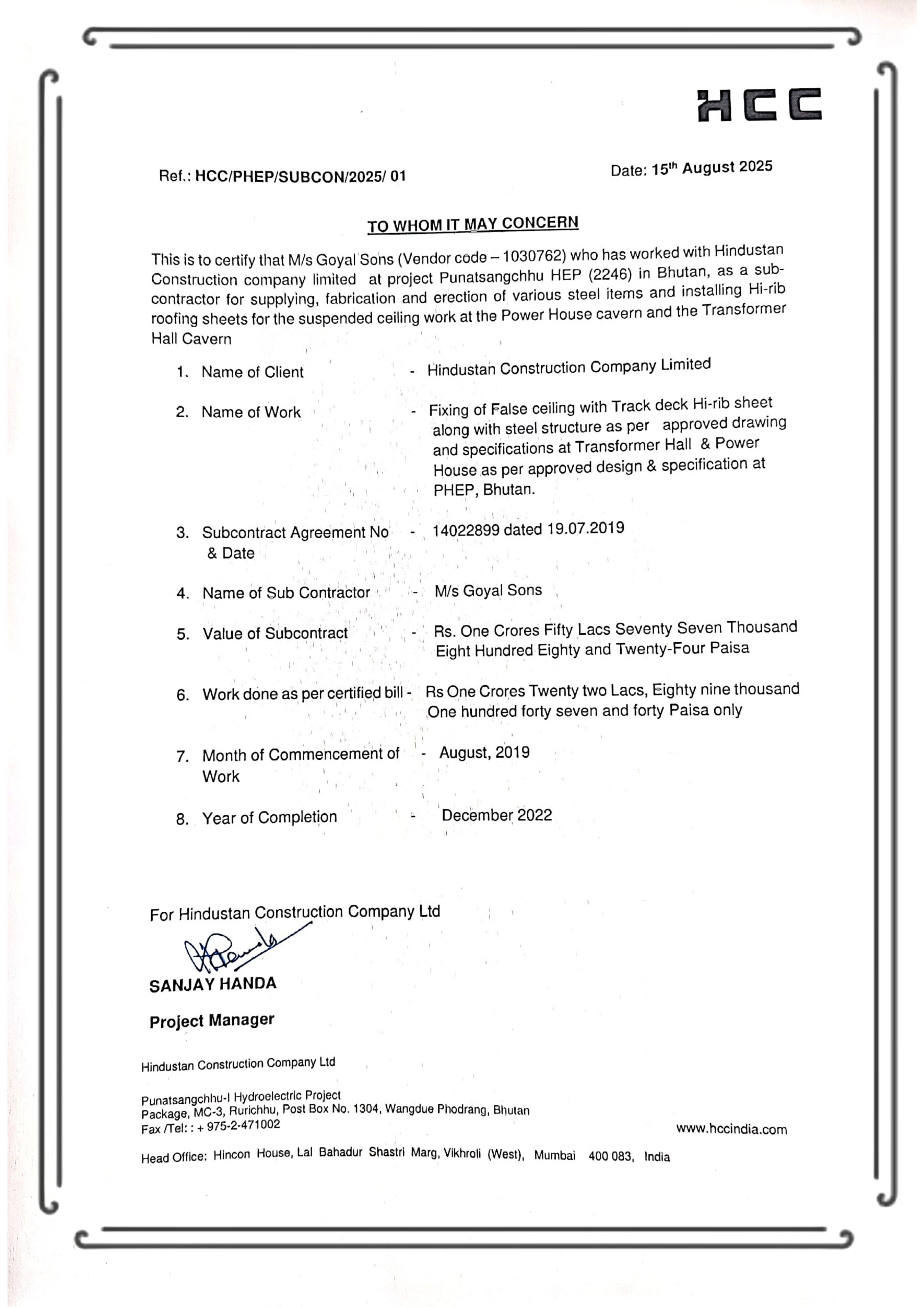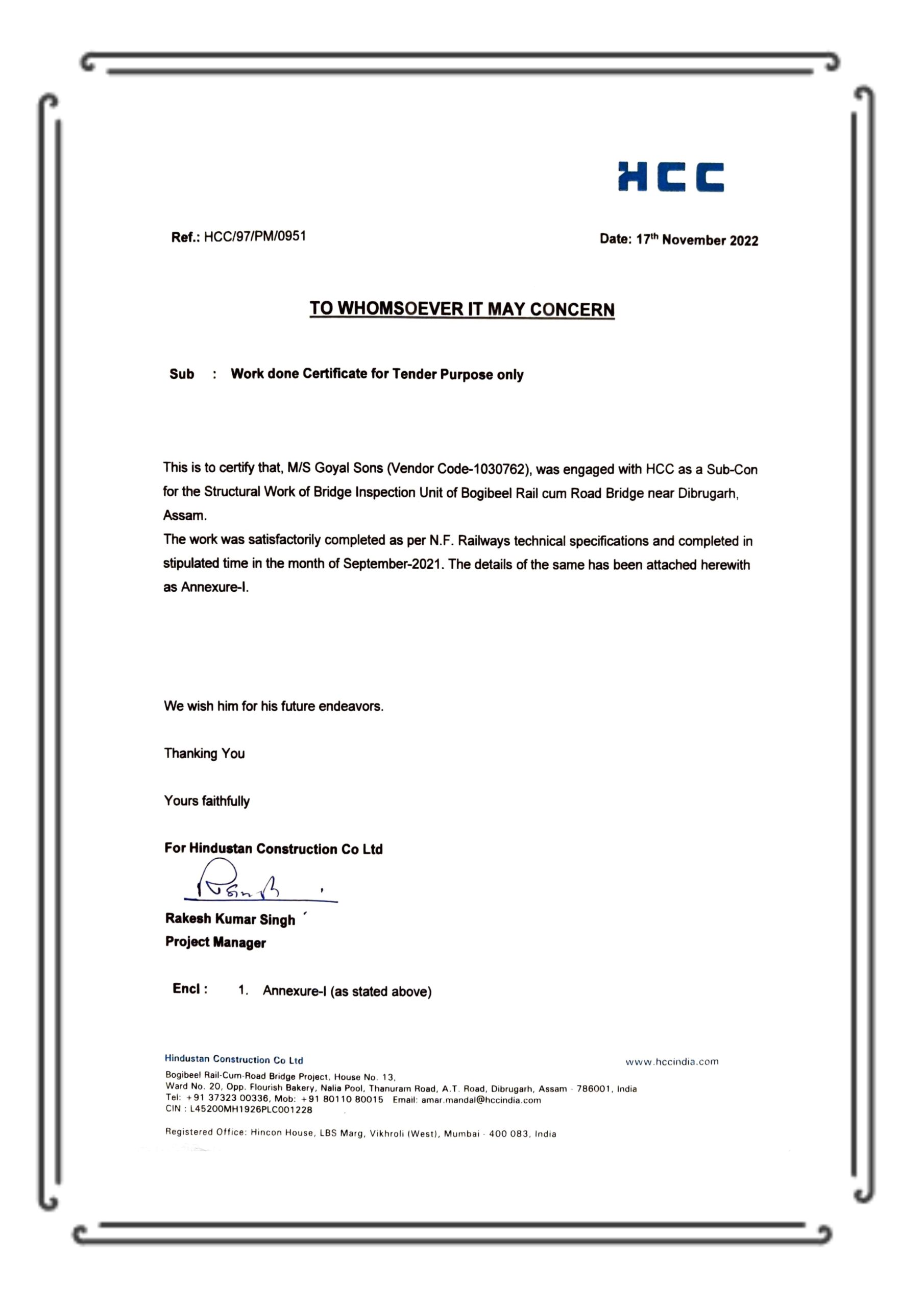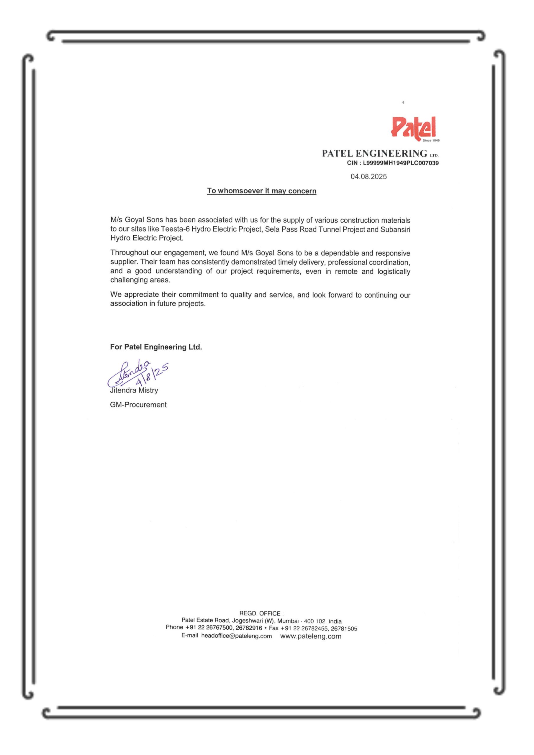 Founded in 1998 by Late Mr. Ramesh Goyal, Goyal Sons began by supplying to hydroelectric projects along the Teesta River. Today, under the leadership of Mr. Saiyam Goyal (Managing Partner), the company has expanded into infrastructure execution, carrying forward a strong legacy with a modern vision.