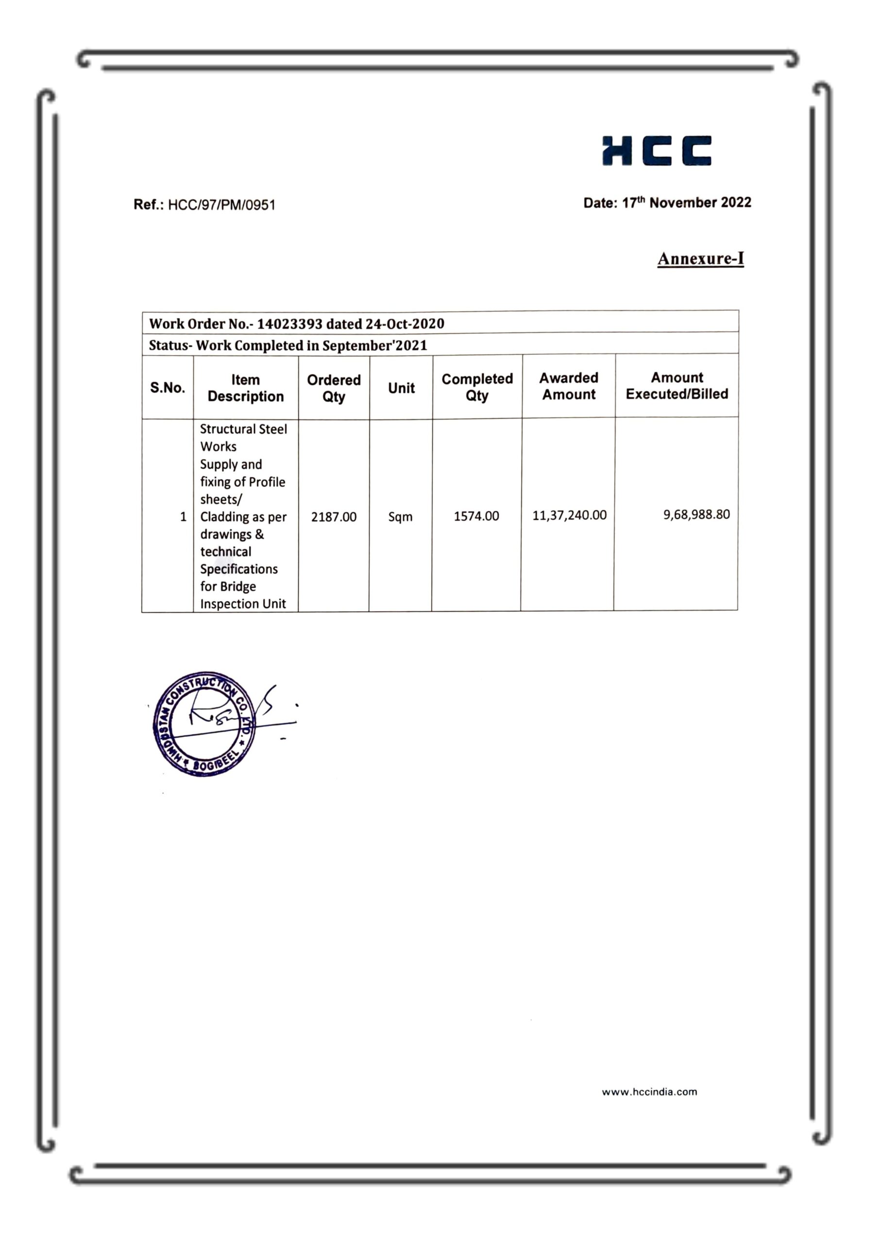 Supply & installation of cladding for Bridge Inspection Unit, executed within strict timelines.
